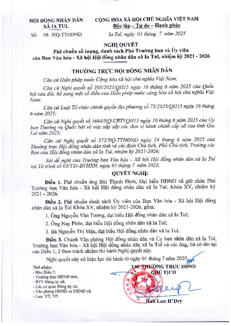 | Tiêu đề văn bản | Nghị quyết phê chuẩn số lượng, danh sách Phó Trưởng ban và ủy viên của Ban VH-XH của HĐND xã | ||