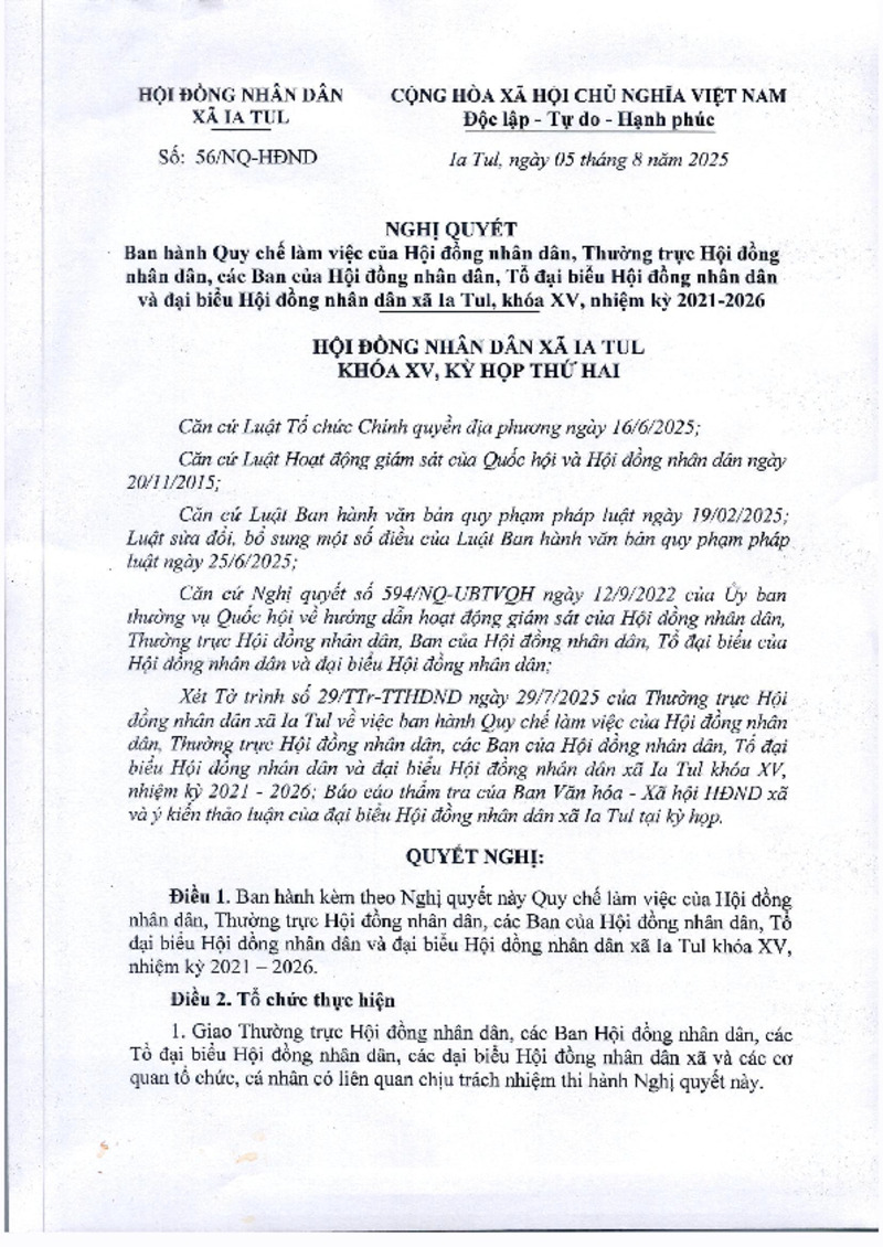 | Tiêu đề văn bản | NQ ban hành Quy chế làm việc của HĐND, TT HĐND, Ban HĐND, Tổ ĐB HĐND và ĐB HĐND xã Ia Tul khóa XV, nhiệm kỳ 2021-2026 | ||