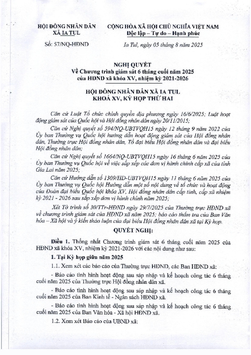 | Tiêu đề văn bản | NQ về Chương trình giám sát 6 tháng cuối năm 2025 của HĐND xã khóa XV, nhiệm kỳ 2021-2026 | ||
