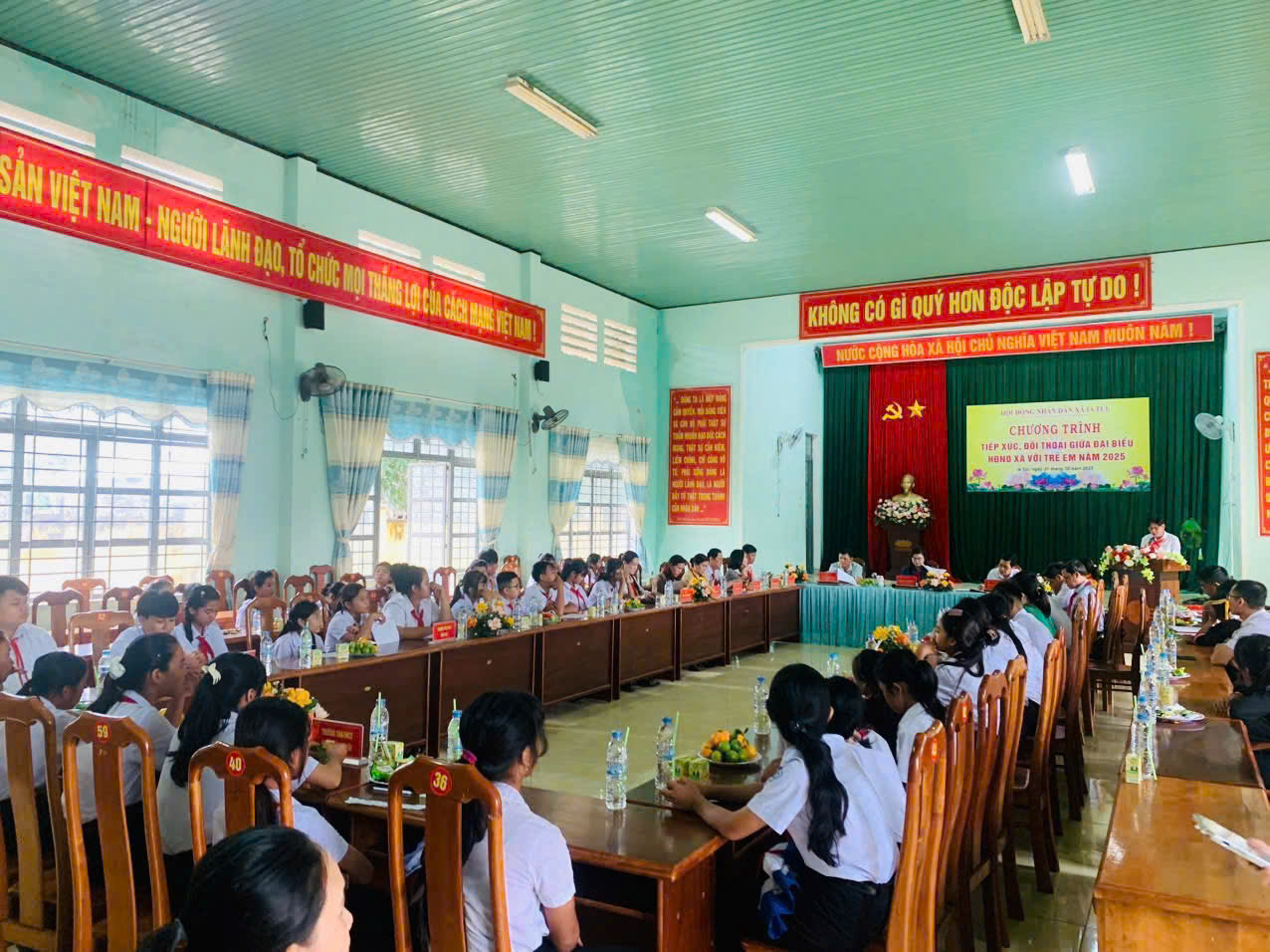 - Tại buổi đối thoại, trong không khí thân mật, cởi mở, đã có 14 lượt ý kiến được các em trình bày. Ngay sau những câu hỏi, lần lượt các đồng chí đại diện lãnh đạo xã và đại diện các cơ quan, ban, ngành của xã đã giải đáp thắc mắc về những vấn đề các em quan tâm như: Vấn đề tuyển sinh và hướng nghiệp cho học sinh; định hướng và giải pháp sử dụng mạng xã hội một cách hiệu quả; đầu tư xây dựng Nhà đa chức năng để hoạt động phong trào và hoạt động thể dục thể thao một cách hiệu quả; xây dựng Phòng thực hành Tin học để tạo điều kiện cho các em được học và thực hành; kế hoạch xây dựng những hoạt động tập bơi vào mỗi kĩ nghỉ hè; biện pháp ngăn chặn việc bày bán các mặt hàng không rõ nguồn gốc trước cổng trường; kế hoạch giám sát chặt chẽ hơn các cơ sở giáo dục, bảo trợ xã hội và đảm bảo quyền trẻ em được thực thi đúng mức; đầu tư xây dựng các khu vui chơi cho trẻ em; tuyên truyền an toàn giao thông, phòng - chống tai nạn thương tích, đuối nước, xâm hại, bạo lực trẻ em, bạo lực học đường