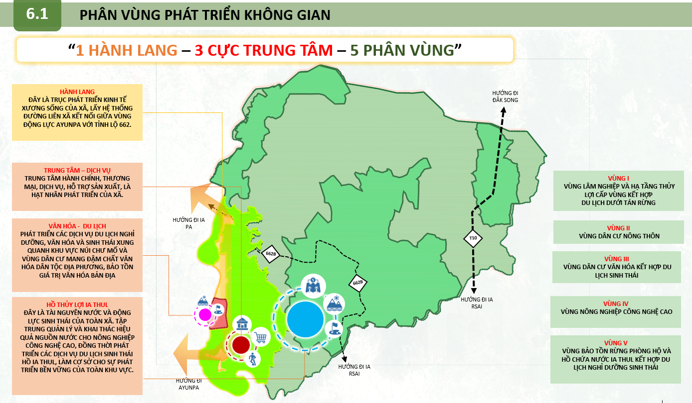 Một hành lang: Đây là trục phát triển kinh tế xương sống của xã, lấy hệ thống đường liên xã kết nối giữa vùng động lực AyunPa với tỉnh lộ 662. Hành lang này đóng vai trò then chốt trong việc liên kết các Vùng với các Cực và thị trường, đảm bảo nguồn nước ổn định và tạo ra một dải không gian kinh tế xanh, bền vững.